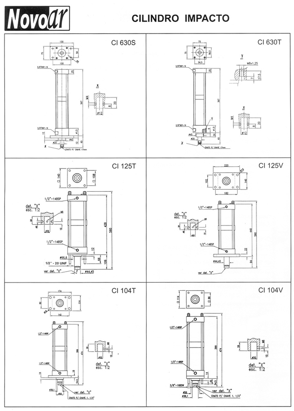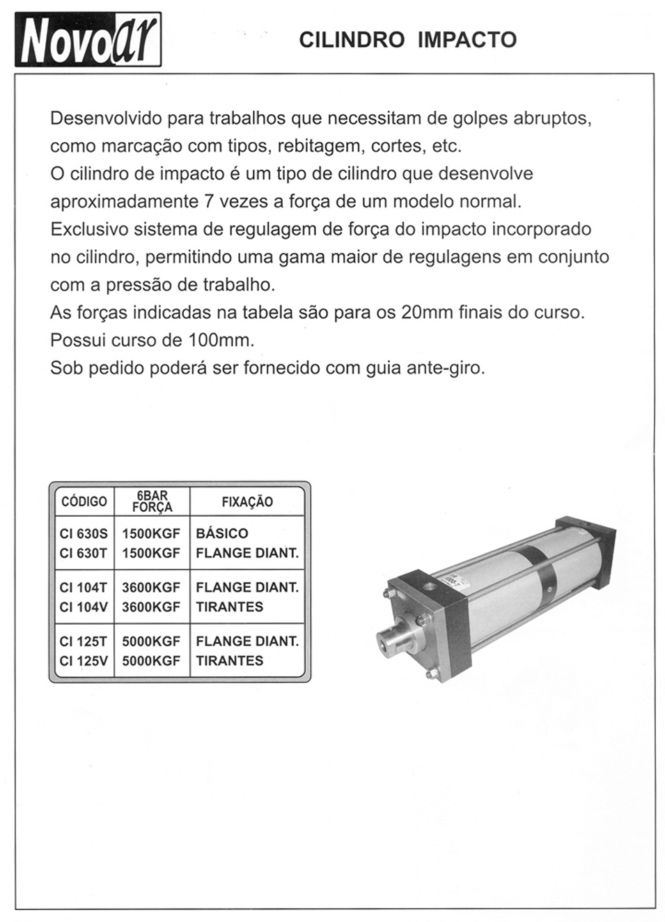O Cilindro Pneumático de Impacto Novo Ar são fabricados em 3 opções de força 1500 , 3600 e 5000 Kgf . Desenvolvido para realizar trabalhos onde se necessita de golpes abruptos, a força do impacto pode ser regulado através de uma sistema exclusivo de regulagem incorporado ao próprio cilindro.