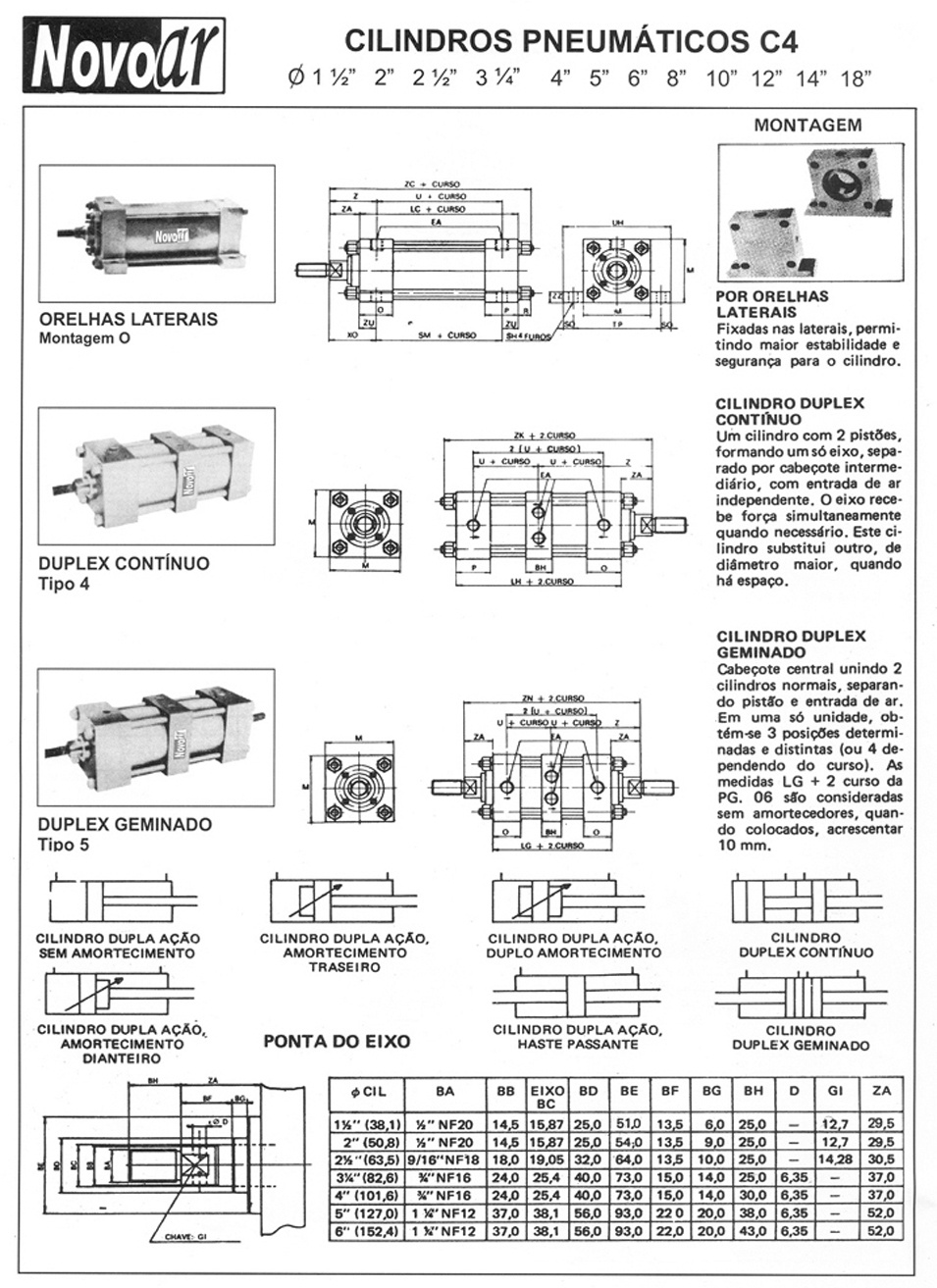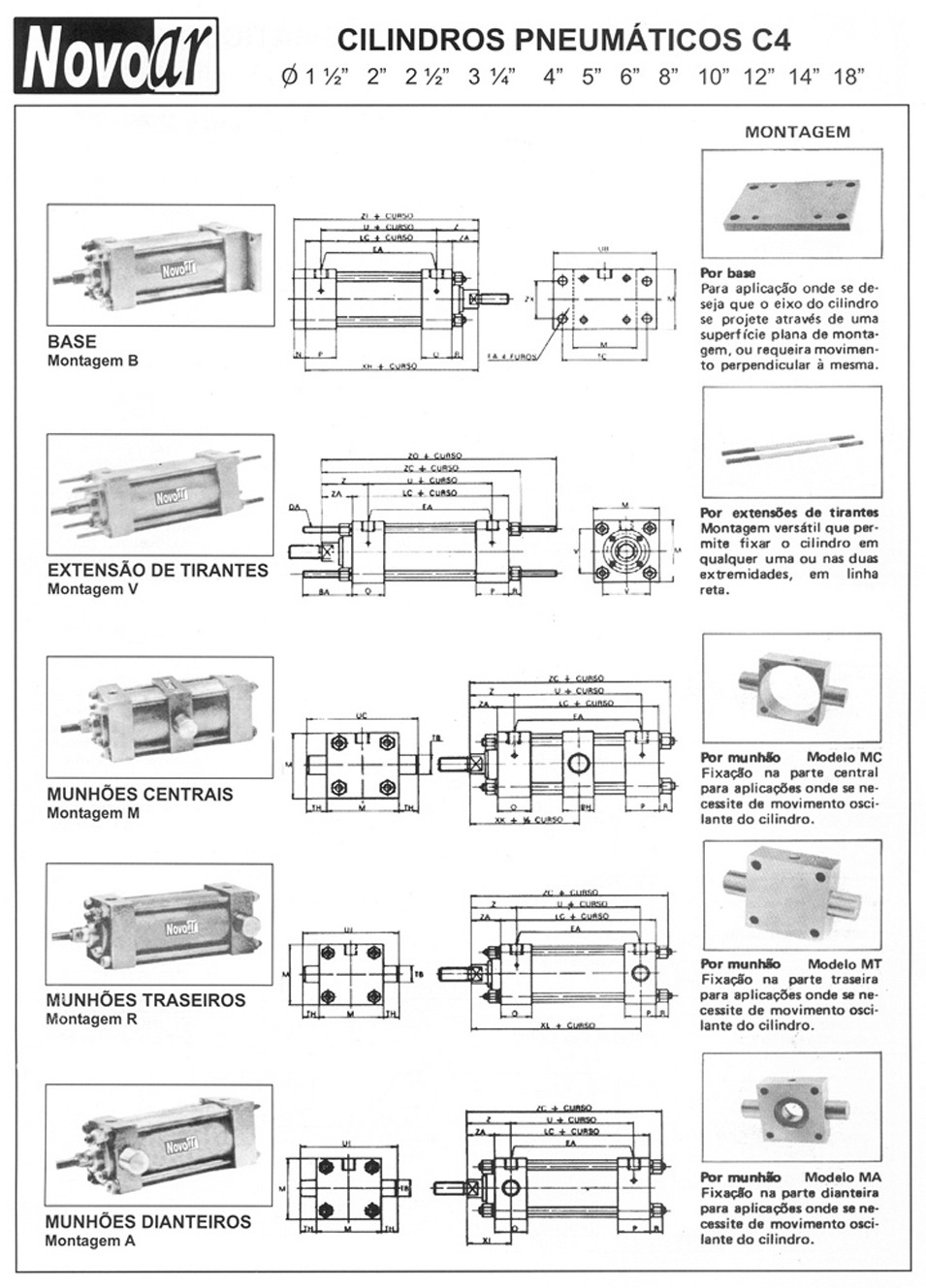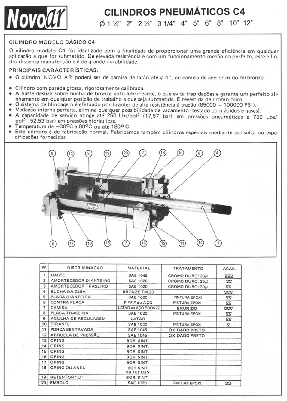 Os Cilindros Pneumáticos Novo Ar linha C4 são fabricados nos diâmetros de 1.1/2” a 30” , idealizado com a finalidade de proporcionar uma grande eficiência em qualquer aplicação a que for submetido suportam pressões de trabalho ate 18 bar , com duplo amortecimento regulável , vedações para baixa , alta temperatura e sem lubrificação . Poderá ser fabricado em tubo de latão até Ø 4”. O cilindros pneumático linha C4 são extremamente robustos de alta ciclagem proporcionando alta durabilidade.