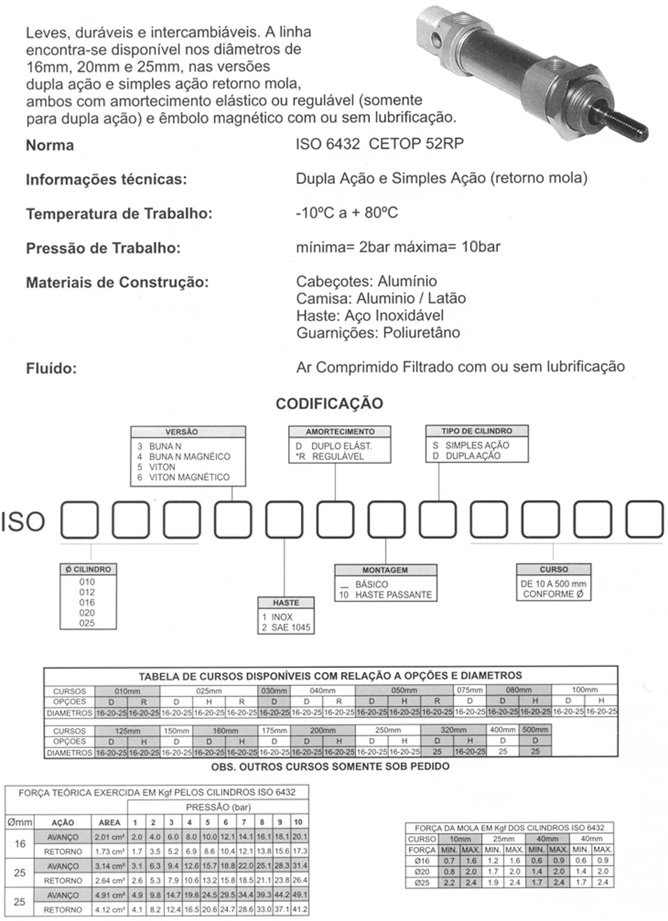 Leves , duráveis e intercambiáveis . A linha encontra-se disponíveis no diâmetro de 16 a 25 mm nas versões de dupla ação e simples ação , confeccionados com a opção de amortecimento elástico ou regulável e embolo magnético.
